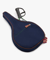 The padel racket holder will keep your racket safe without sacrificing style. Made in dark blue canvas, it has dark brown leather details, an inside pocket, a zippered closure, and an adjustable shoulder strap.