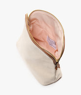 The Trousse Aspen is one of our best sellers, and the large version of this style is the perfect travel accessory for longer travels. Made of a strong material, panamone, this trousse has smooth light leather details and gold metal hardware. The waterproof inner lining with an integrated pocket protects the bag from leaks or spills.