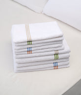 Add a touch of elegance to your bathroom with the Taviano towel set. This set includes a guest towel and a bath towel, both made of soft 550 g/m² 100% cotton terry cloth, which guarantees exceptional absorbency and comfort. The towels are white and decorated with three green-coloured cords on one side, adding a refined design detail. The sizes are perfect for every need: the guest towel measures 40x60 cm and the bath towel 60x110 cm. Whether for everyday use or for an extra touch of class for your guests, the Taviano towel pair is ideal. Customisation can be activated and will be present on both products of the pair.