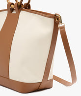 The Canvas Handbag is our company's most convenient and versatile handbag model. Due to its capacity, the large version can be integrated and used as a travel bag. This bag from the S24 summer collection is made of cream-colored cotton with a smooth leather-colored middle and bottom. It has an adjustable leather shoulder strap, bamboo handles and zipper closure.
