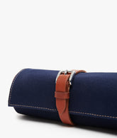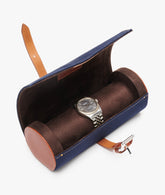 This watch holder is the ideal gift for watch enthusiasts or for those who may not like to wear their watch all the time but want to carry it with them. Made in collaboration with Verga 1947, one of the pillars of Milanese watchmaking, this case features a canvas exterior with leather details. The strap, also in light-colored leather, has a buckle closure and a soft suede lining. This travel accessory also has a cushion to comfortably store up to three watches.